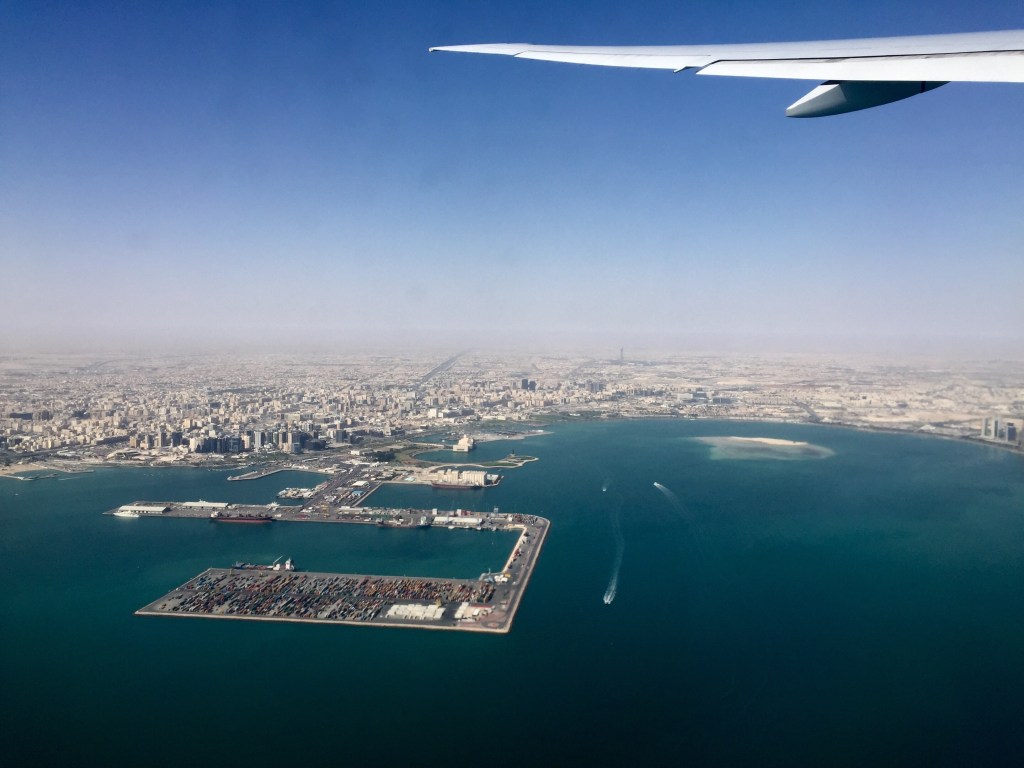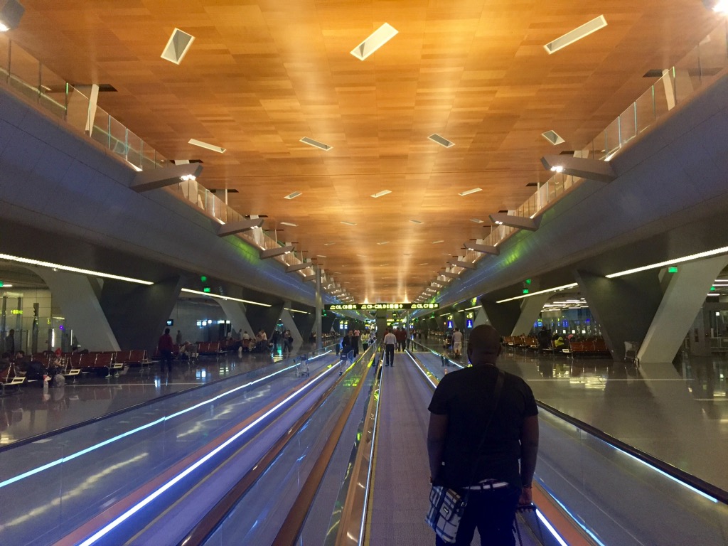 This is inside Hamad airport in Doha, Qatar. It was….shiny, to say the least. Those are raised shuttle tracks on either side of the photo.